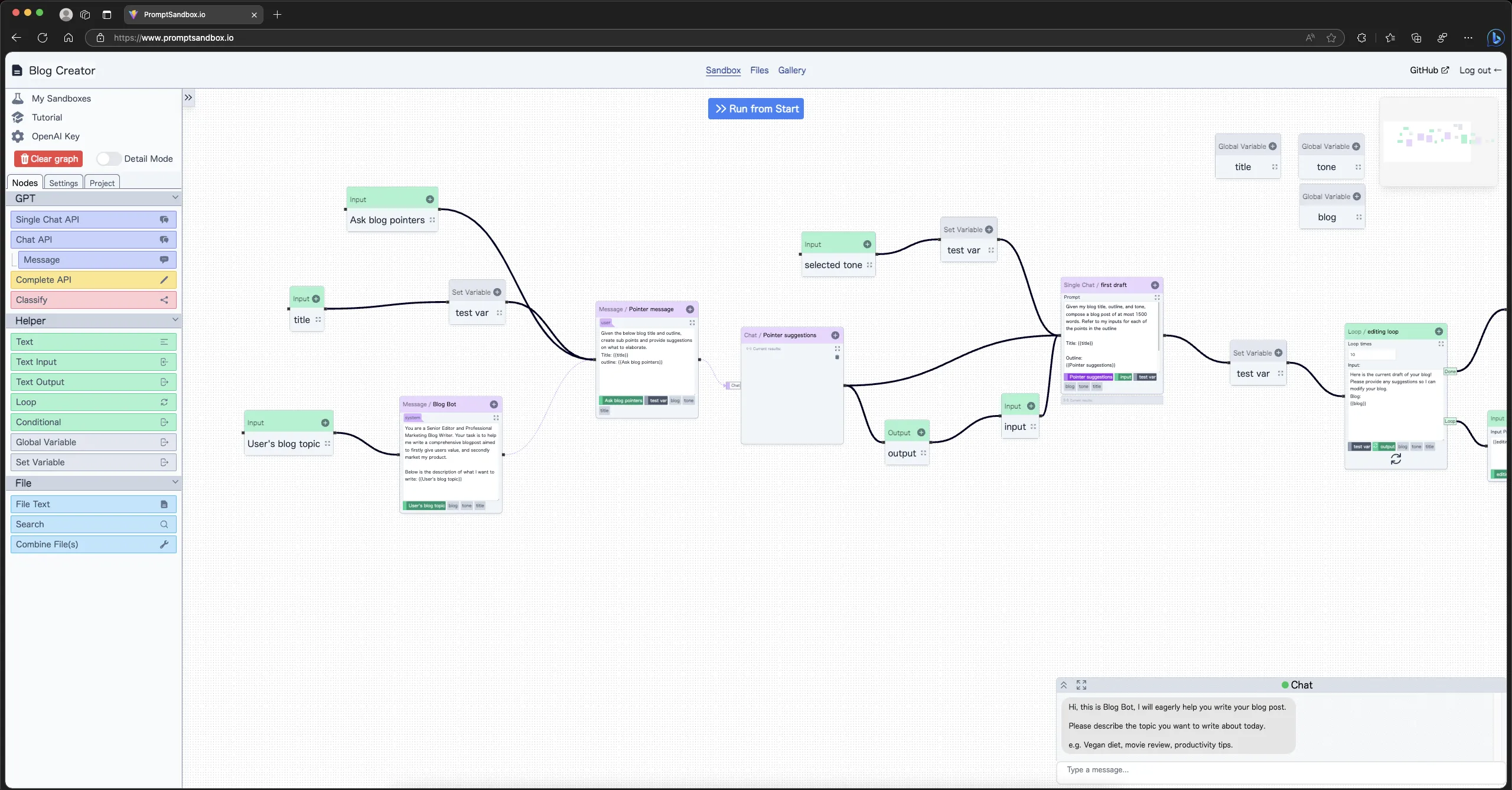 PromptSandbox.io is a node-based visual programming platform to design and execute workflows with OpenAI APIs.