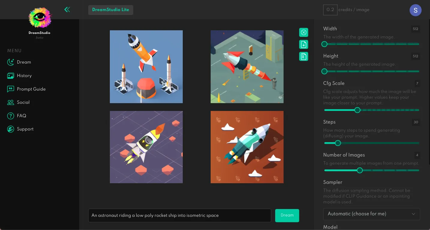 Dream Studio is a website for generating images with Stable Diffusion, a text to image model.