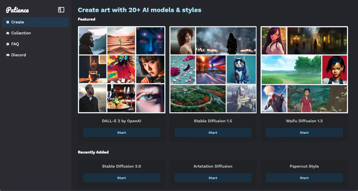 Patience has folder creation, collections/history saving, and a few different models to choose from. It also allows for the modification of various diffusion settings like size and sampling method.