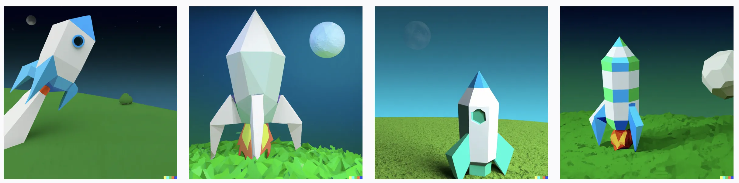 Saya memutuskan untuk hanya memulai dengan DALLE dan prompt Low poly white and blue rocket shooting to the moon in front of a sparse green meadow dan melihat apa yang terjadi.