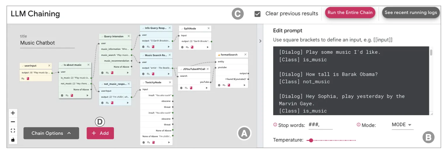 PromptChainer memiliki tampilan rantai, serta tampilan individual dari node. Ia juga memberikan fitur debugging.
