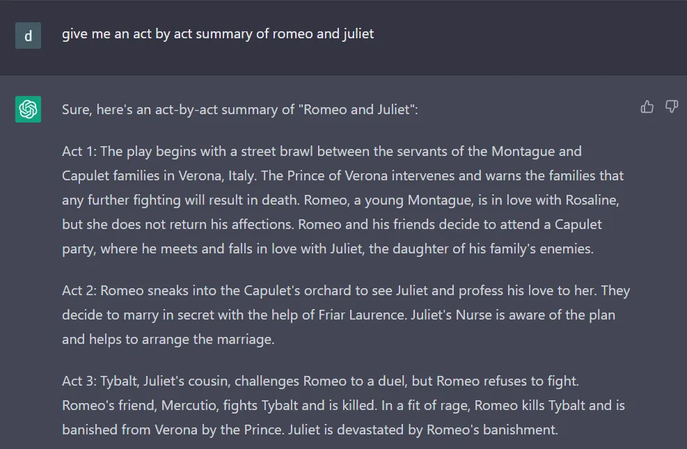 時には、ChatGPT はその作品をよく知っているため、追加のテキストを何も貼り付けずに作品を要約することができます。例えば、「ロミオとジュリエット」を章ごとに要約してもらいましょう。頑張って 24,000 語を読む代わりに、300 語以下でその要点を把握することができます。