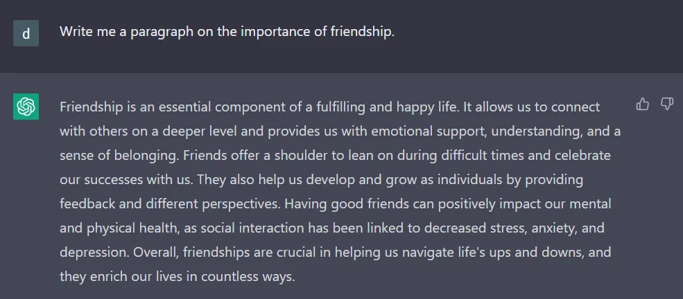 AI、例えば ChatGPT のようなものは、一瞬でエッセイやブログ記事を生成することで知られています。しかし、彼らが作り出す記事は、よくある平均的でドライなものです。文章に少し魅力やテイストを加えるために何か工夫が必要です。 それを手早く実現する方法の一つは、ライティングスタイルを指定したり、有名な著者の名前をプロンプトに入れることです。 例えば、友情の重要性についての段落が欲しいとします。 「友情の重要性について段落を書いてください」という一般的なプロンプトでは、ChatGPT から一般的な反応が返ってきます。