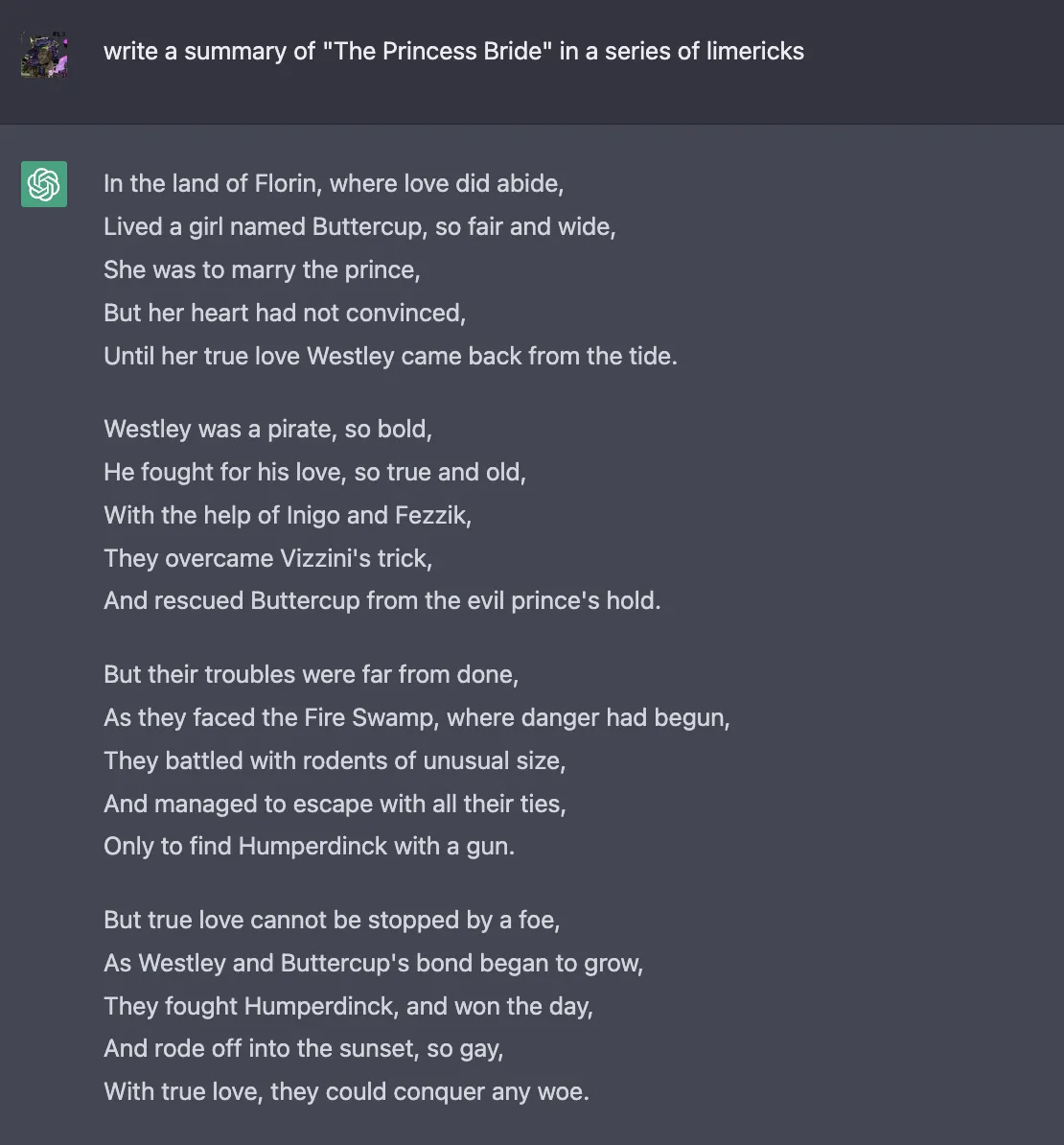それは適度にフォーマルな口調で話し、いくつかの詳細をかなり良い精度で提供します。ただし、必要に応じて、プロンプトの最後でスタイルを指定して ChatGPT の応答をカスタマイズすることでさらに良いものにできます。より会話的な応答が必要な場合は、フレンドリーな、または非公式な口調で話すように指示します。より読みやすい形式が必要な場合は、箇条書きのリストで回答するように指示します。おもしろい応答が必要な場合は、一連のリメリック (詩の形式の 1 つ。五行戯詩とも呼ばれる。私の個人的なお気に入り。) の形で答えを出すように指示します。
