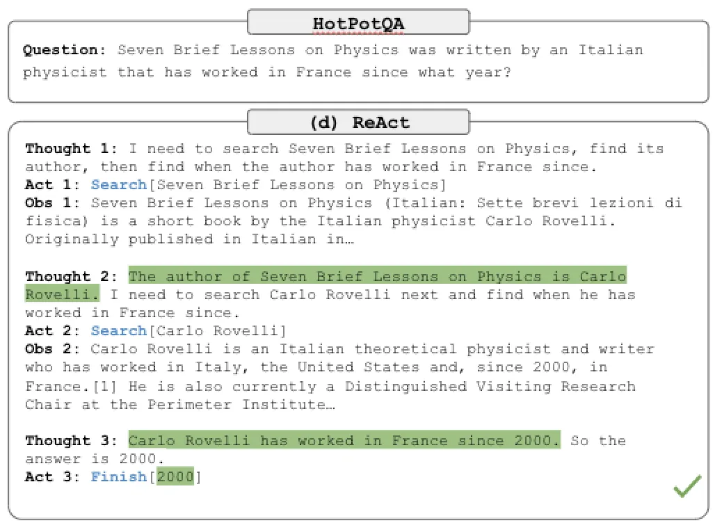 Розглянемо наступне зображення. Запитання у верхньому полі взято з HotPotQA2, набору даних із відповідями на запитання, які потребують складних міркувань. ReAct може відповісти на запитання, спочатку обміркувавши його (Thought 1), а потім виконавши дію (Act 1) надсилання запиту до Google. Потім він отримує певний огляд (Obs 1) і продовжує цей цикл думок, дій, спостережень, доки не досягне висновку (Act 3).