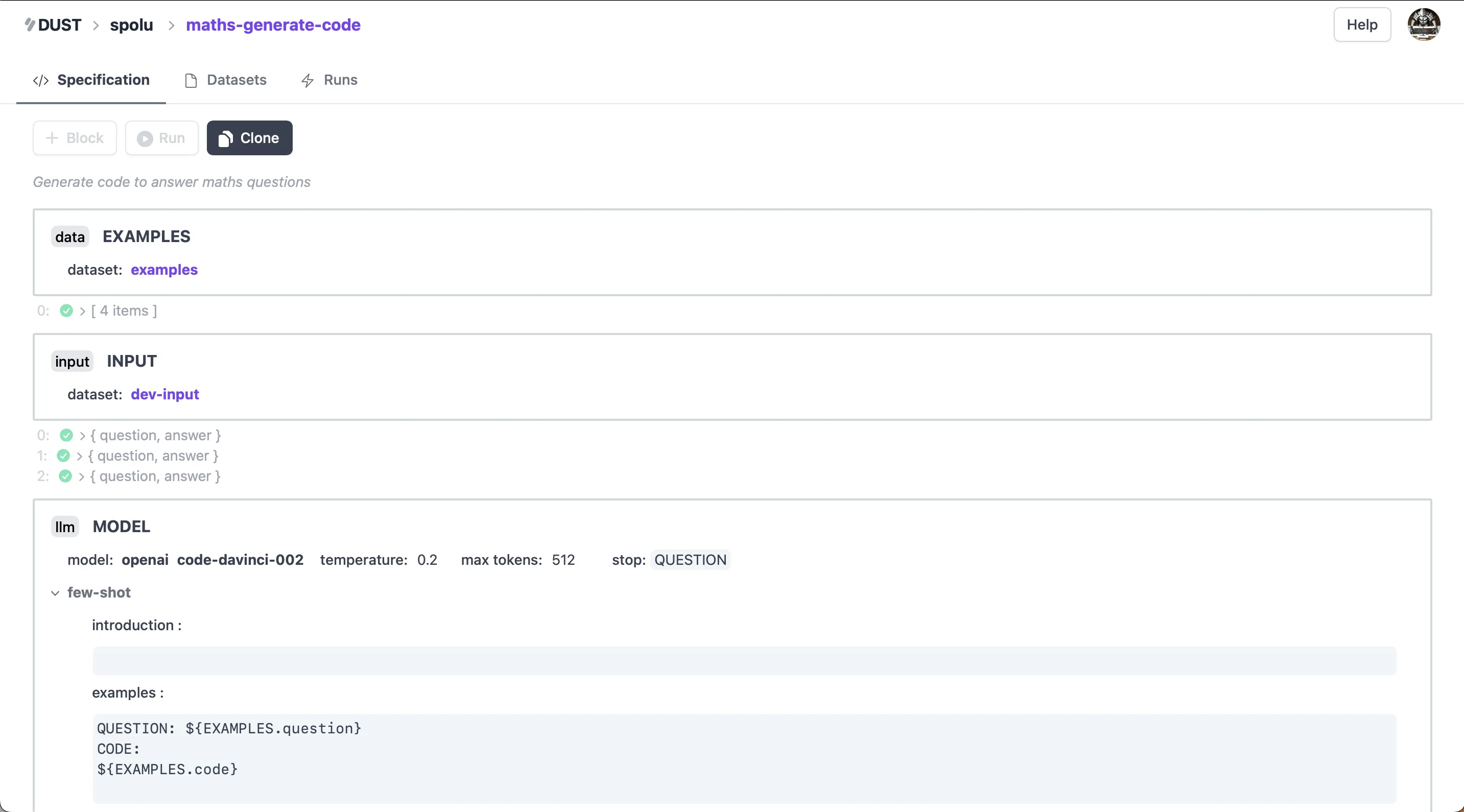 Dust provides robust tooling in the form of a number of composable "blocks", for functions like LLM querying, code snippets, and internet searches. Dust also supports the use of datasets and automatically testing prompts against datasets.