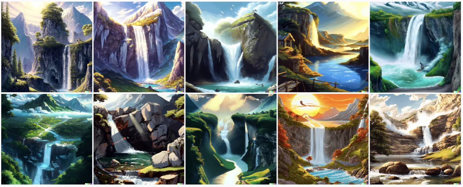 在提示中重複相同的詞語或者類似短語會導致模型在生成的圖片中強調該詞語。例如,@Phillip Isola 使用 DALLE 生成了這些瀑布: